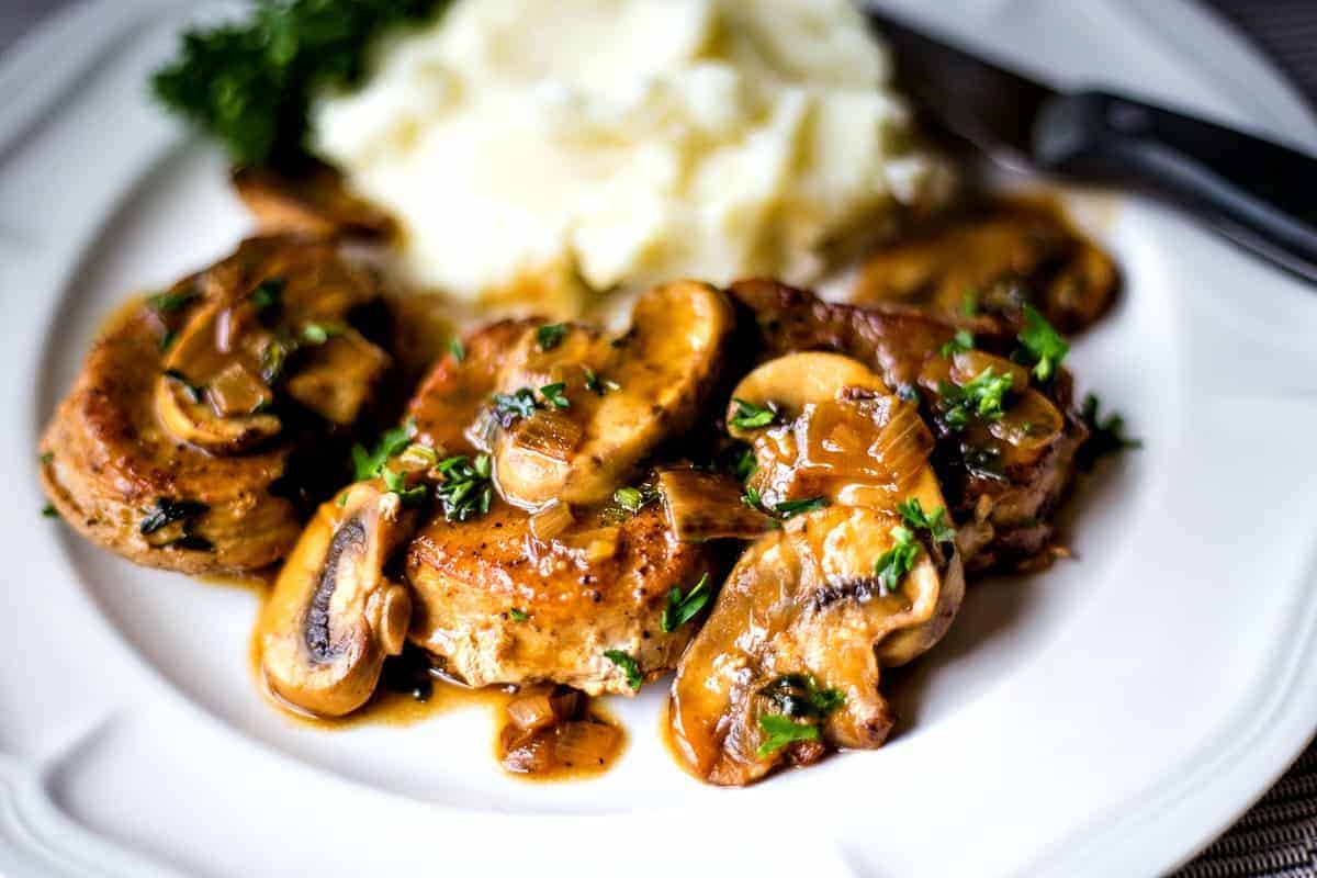 Pork medallions in a mushroom marsala sauce with cauliflower purée and asparagus